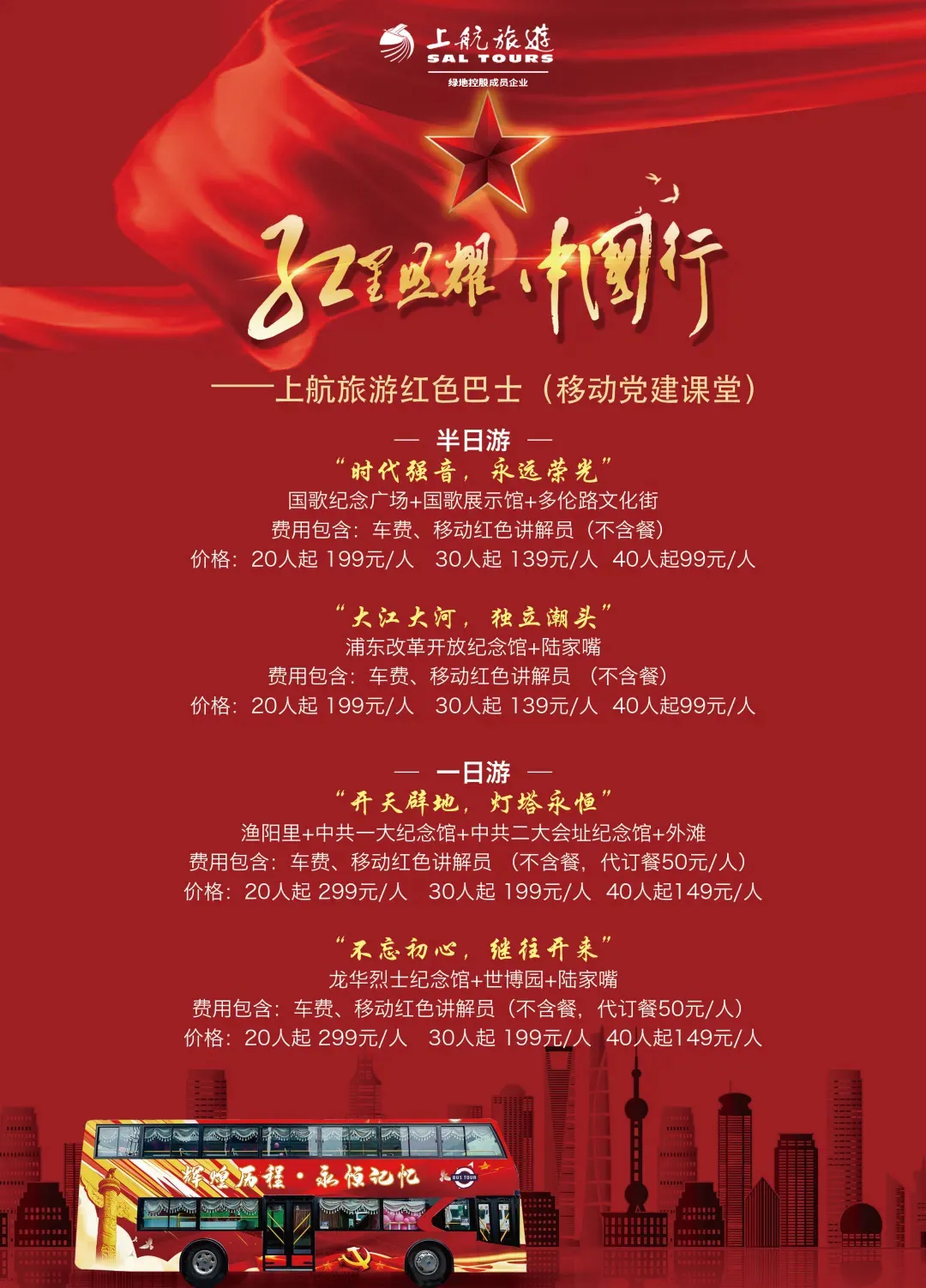 站在“两个一百年”奋斗目标历史交汇点上,在迎接中国共产党百年华诞的重大时刻,绿地上航旅游集团围绕党史学习教育,着力促进红色旅游发展,打造红色旅游品牌,丰富红色旅游产品,创新红色旅游发展模式。其中,绿地上航旅游红色巴士就是最具代表性的佼佼者,为上海城市增添了一道靓丽的流动风景。