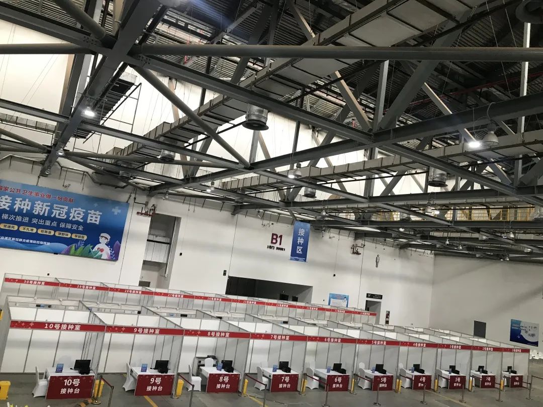 据悉,临时方舱接种点面积达1万平方米,内有8大区域,区块划分清晰、分工明确,包括测温区、等候区、接种区等。