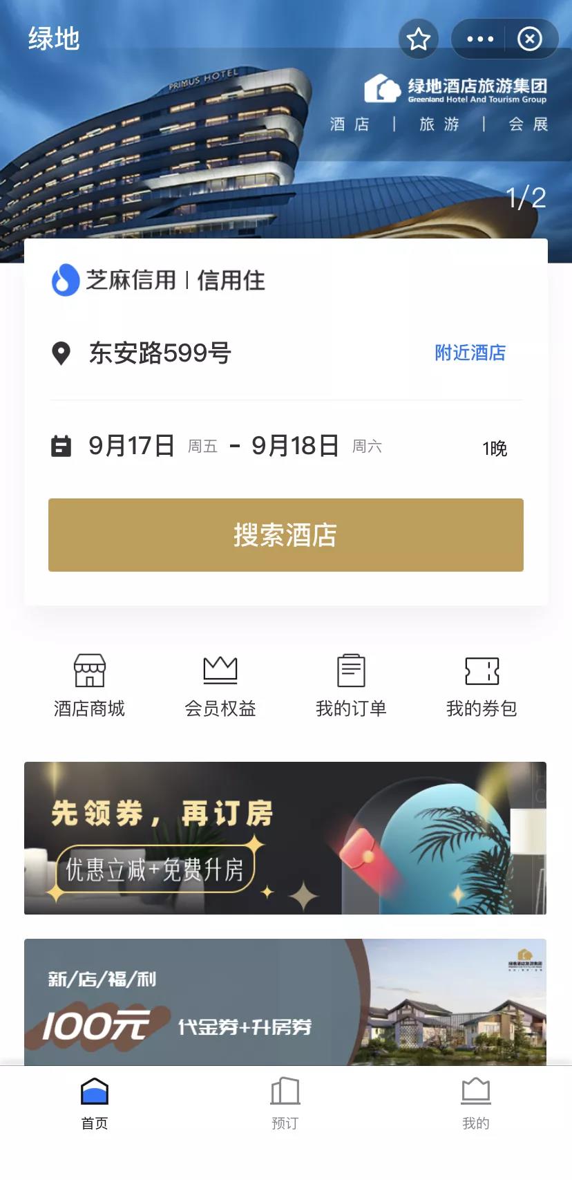 图为绿地酒店的支付宝小程序页面
