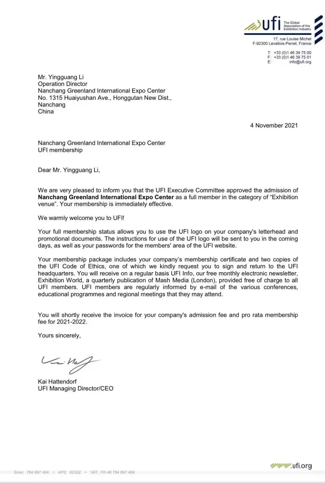 2021年11月6日,经国际展览业协会(UFI)行政委员会审议,通过了绿地国际会展南昌绿地国际博览中心加入UFI的申请。这标志着南昌绿地国际博览中心成为UFI正式会员(展览场馆类别),也体现了绿地会展场馆的国际化、专业化水平得到国际会展业同仁的高度认可。