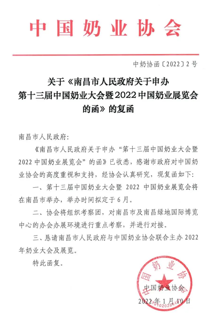 2022年初,中国奶业协会给南昌市人民政府的复函中确定,第十三届中国奶业大会暨2022中国奶业展览会拟定于2022年6月在绿地国际会展南昌绿地国际博览中心举办,该展会展览面积预计10万平米。