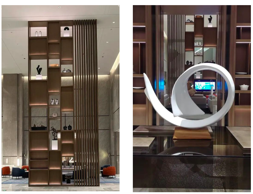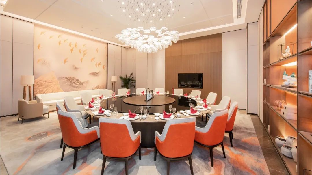 铂骊经典黑白灰风格中融入取自黄梅戏的橙色,冷暖呼应,从色彩上传递徽式文人风雅。