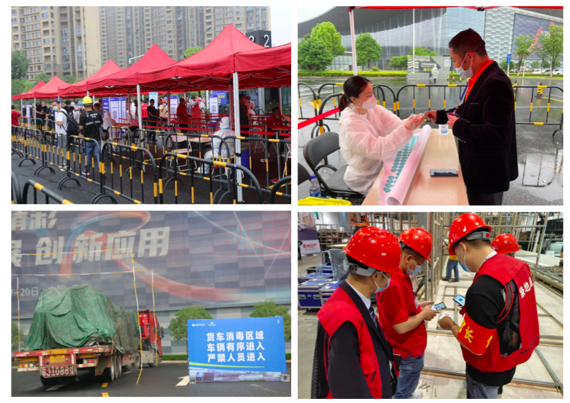 布展期间,根据《布展期间防疫工作要求和流程》,针对搭建施工人员、布展车辆、搭建现场采取不同的防控措施,“因情施策”、“人车分流”。除严格遵循“六必”总原则、严格落实“一测一扫三查一戴”的常态化疫情防控措施外,创新完善了以下举措:在搭建施工人员入口处设置核酸检测点,并根据实际情况增减采样条线,完成采样后贴标,这一新增的小细节,既方便查验又体现出展馆服务的温度;同时,在物流通道上增设了喷雾消杀系统,信息核验后的货车驶入物流通道经喷雾消杀系统充分消杀后方可放行入馆,做到“防疫工作不留死角”;此外,搭建现场管控方面,新增核查搭建工人信息环节,杜绝“浑水摸鱼”现象,使“防疫工作无漏洞”。