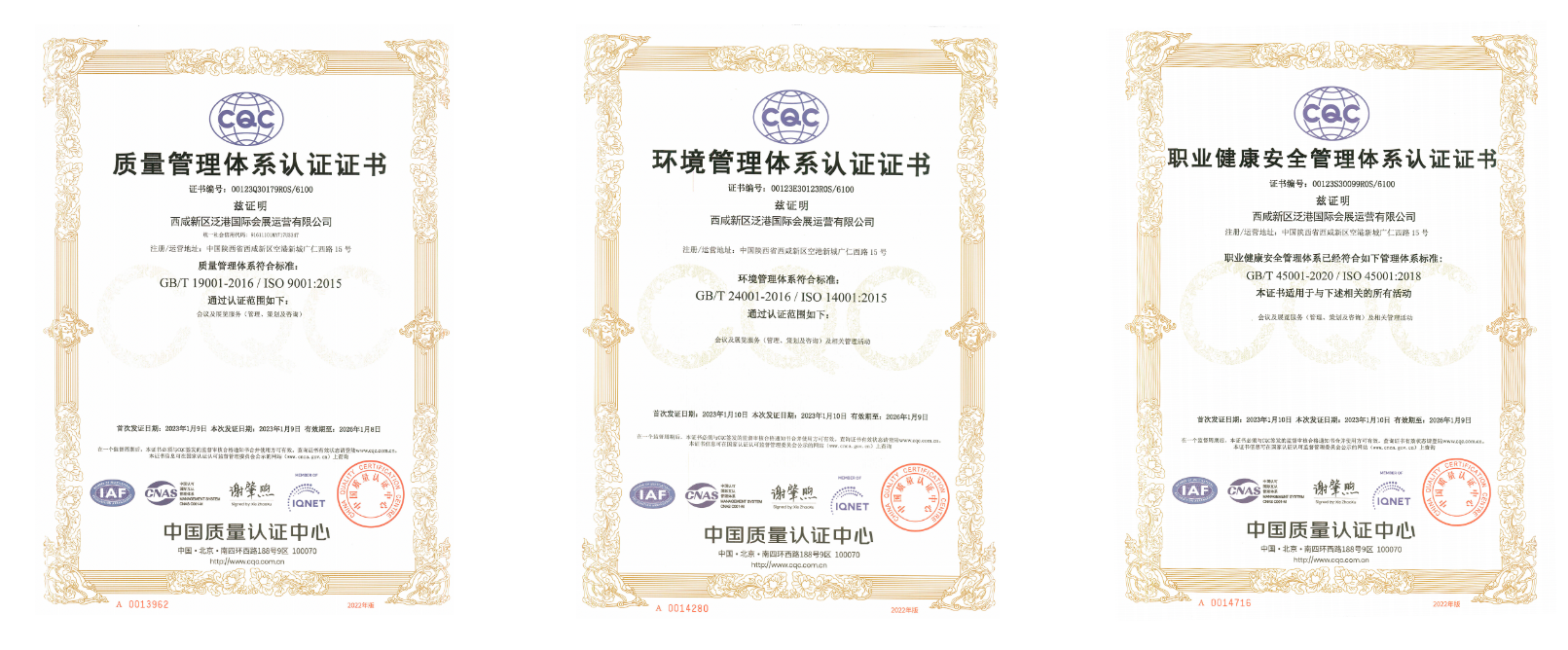 同月,经中国质量认证中心认证,西安临空会展中心还获得了ISO9001(质量管理体系)、ISO14001(环境管理体系)、ISO45001(职业健康安全管理体系)三体系认证。