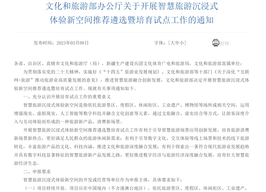 3月8日,文旅部发布《关于开展智慧旅游沉浸式体验新空间推荐遴选暨培育试点工作的通知》,并启动“智慧旅游沉浸式体验新空间”遴选工作。遴选工作将于4月17日截至。