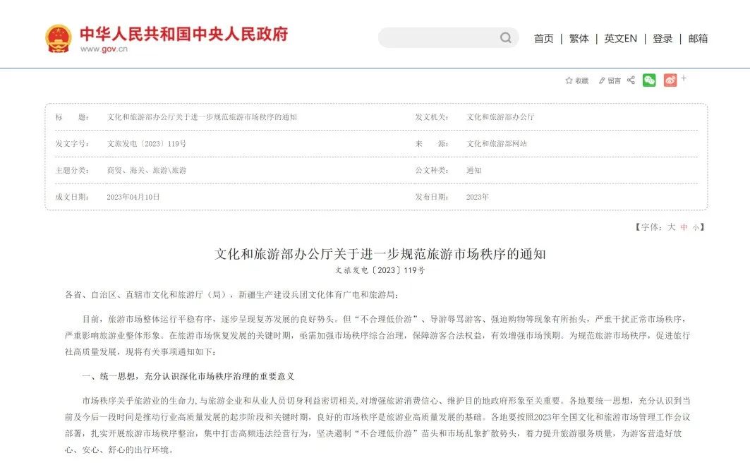 4月10日,文旅部办公厅印发《关于进一步规范旅游市场秩序的通知》,重点从规范旅行社经营行为、提升导游服务质量、严厉打击市场不当行为、丰富行业监管手段、妥善处理涉旅纠纷舆情等方面入手,严厉打击干扰市场秩序的违法违规行为。《通知》也要求各地严格参照标准执行,扎实开展旅游市场秩序整治,集中打击高频违法经营行为,着力提升旅游服务质量,为游客营造好放心、安心、舒心的出行环境,并明确旅游市场秩序治理情况将纳入当年政府质量工作考核。