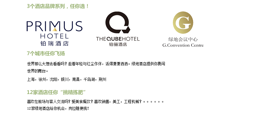 2016年度绿地酒店集团化招聘日活动“与绿地酒店共蓬勃”将于11月25日-26日在中国区展开。旗下的3个酒店品牌系列,7个城市,12家酒店一起发力,共同参与!无论您是加入绿地酒店大家庭不久的新生,或是和我们曾经相识合作过的老友,又或是跃跃欲试想要加入我们的小伙伴,我们在此邀请并期待您的光临!